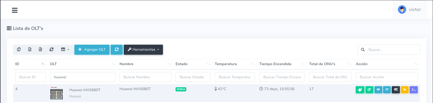 El acceso al diagnóstico de logs de alarmas se encuentra en la lista de OLT's. Si la OLT es compatible con esta funcionalidad podrás ver el botón con el icono